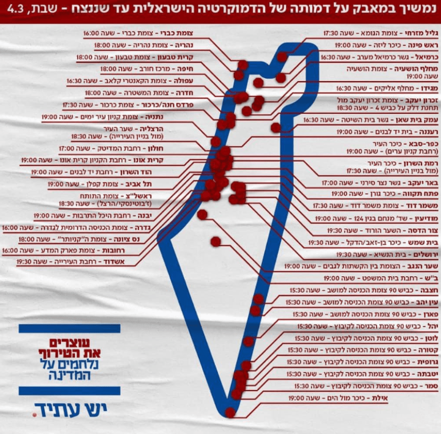 Et qu’en est-il de l’opposition, le visage de la critique de l’Occupation, celle qui a battu le pavé l’année dernière, elle qui est pour une solution à deux États, elle qui est “démocrate” ? Ce n’est pas ce qui ressort des cartes publiées l’an passé par le parti dit “centriste” de Yair Lapid, Yesh Atid. Ces cartes, l’une produite dans le cadre de la gay pride, l’autre pour les manifestations “pour la démocratie”, traduisent bien le consensus qui existe dans le débat public israélien, y compris chez les “modéré·es”, à propos de la suprématie juive, et l’aveuglement face au fait colonial entre la Mer et le Jourdain.