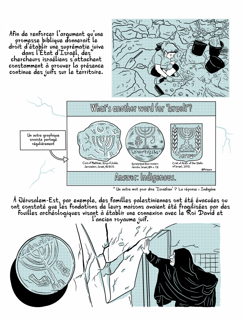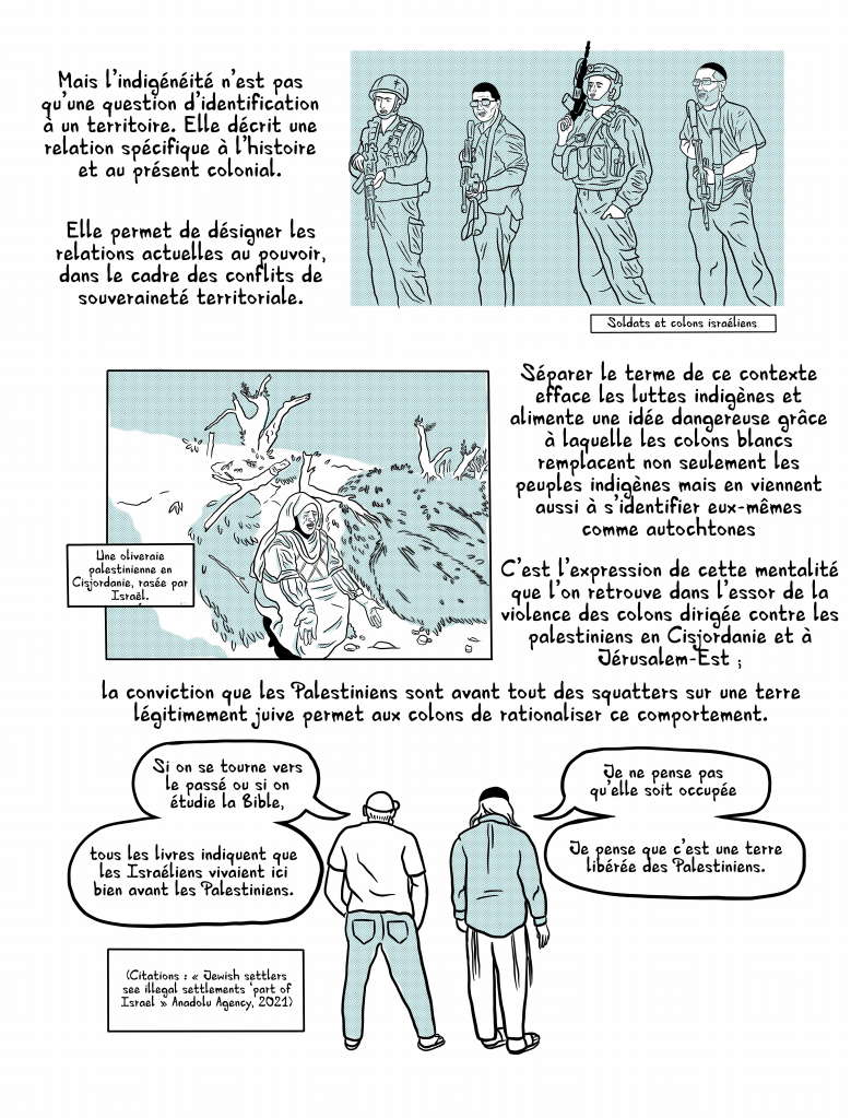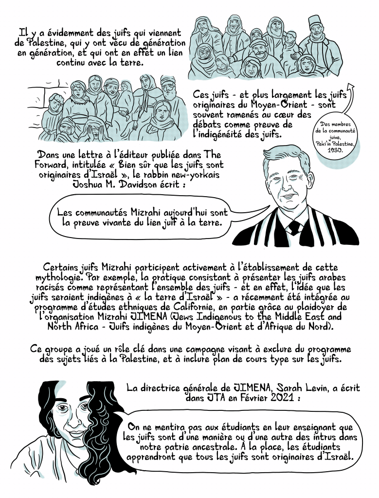 Ces déclarations sont d’une part, le résultat de l’intégration au sionisme d’une conception antisémite de l’identité juive – les Juif·ves hors d’Israël sont des étranger·es – et relèvent d’autre part d’un révisionnisme historique qui évacue l’histoire de la Nakba et tait le sort des Palestiniens. Elles permettent de délégitimer la lutte pour leur libération, et la reconnaissance du sionisme comme un projet colonial de peuplement, dont l’histoire a débuté bien avant la création d’Israël. Elles font de la dépossession des Palestinien·nes, par laquelle le sionisme se concrétise, une condition de l’émancipation des Juif·ves. En creux, elles font des Palestinien·nes les véritables colons de la Palestine, car si les Juif·ves y sont sur leur terre, et si la création d’Israël est le résulat d’un projet de décolonisation, que sont les Palestinien·nes si ce n’est des étranger·es, des envahisseur·ses ?