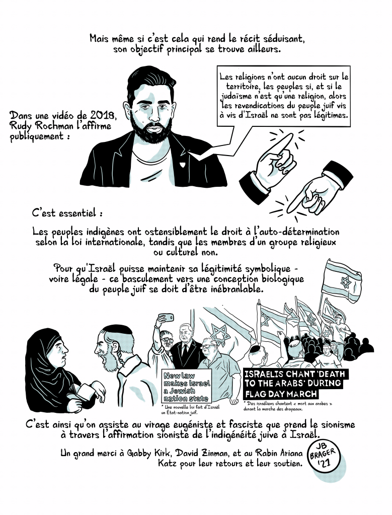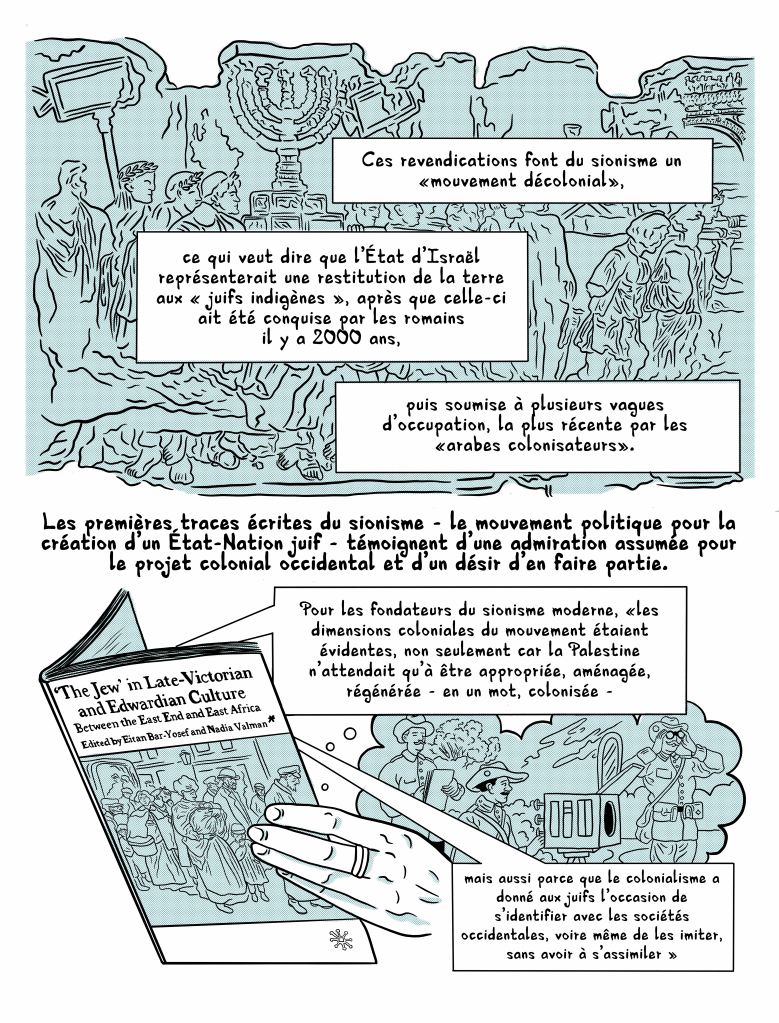 Pour comprendre comment cette formidable inversion s’est construite, notamment dans des espaces qui se revendiquent de l’antiracisme et de la lutte contre l’antisémitisme, nous publions avec son autorisation la traduction d’une bande-dessinée de l’historien et illustrateur Solomon Brager.