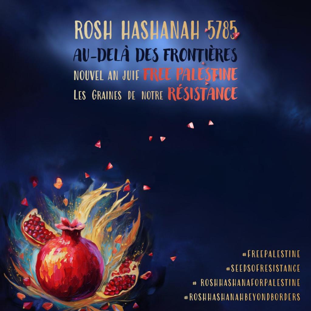 À l’heure où le discours dominant souhaiterait déchirer nos communautés, soyons fort.es de nos alliances et de notre capacité à œuvrer ensemble. Nous invitons aussi celles et ceux à la maison qui se sentent part de la résistance à politiser leur célébration privée en utilisant les hashtags #RoshHashanahforPalestine #RoshHashanahBeyondBorders #SeedsofResistance et comme toujours, #FreePalestine. Nous proposons aussi à celles et ceux souhaitant relayer un événement d’utiliser le même visuel avec les détails de leur événement – visuel disponible ci-après. Partageons les vidéos et les photos des événements en ligne afin de créer un montage les rassemblant (ou envoyez les à tsedekdecolonial@proton.me).