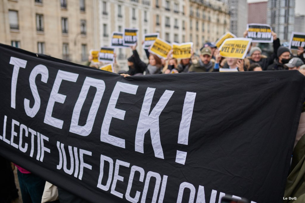 C’est cette même logique qui a conduit Brigitte Stora, dans un article du Nouvel Obs particulièrement ignoble, à voir en nous le dernier avatar de “ces cautions juives, qui dans une perversion prophétique, sont venues témoigner contre leur nom, apportant à l’entreprise antijuive la légitimité qui lui manquait”, et dont “l’histoire de l’antisémitisme est […] jalonnée”. De l’autre côté du spectre politique, l’Observatoire Juif de France (OJF), par la voix de son avocat, a jugé bon de nous qualifier de “Juifs de service des antisémites” au cours du procès intenté à Elias d’Imzalène au motif fallacieux d’apologie du terrorisme, et le magazine Franc-Tireur s’est senti autorisé à titrer à sa une : “Tsedek!, Juifs mais pas trop”. Enfin, dans la vidéo qu’il nous consacre intitulée “Tsedek!, la caution juive des antisémites de gauche”, le CRIF laisse savamment planer le doute en précisant dès la première phrase que nous ne faisons jamais que nous “présent[er] comme juifs”. Selon des modalités diverses, c’est un même procès en traîtrise vis-à-vis des Juif·ves que nous intente ainsi l’intégralité de l’arc sioniste, depuis son aile gauche incarnée par Jonas Pardo et son mouvement – qui depuis sa création a consacré l’essentiel de son énergie militante à attaquer la gauche et à délégitimer le mouvement de solidarité avec la Palestine – jusqu’à son aile la plus explicitement droitière et islamophobe incarnée par l’OJF et le Printemps Républicain, dont Franc-Tireur est l’organe attitré. Leur objectif est simple : faire du sionisme la seule identité juive légitime, de concert avec les principales instances de représentation juives françaises et l’État raciste français. Les sionistes prétendent ainsi dire qui a le droit d’être juif·ve, alors même que certain·es de celles et ceux qui s’acharnent à nous dénier notre judéité ne le sont même pas.
